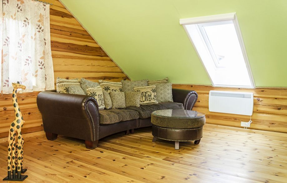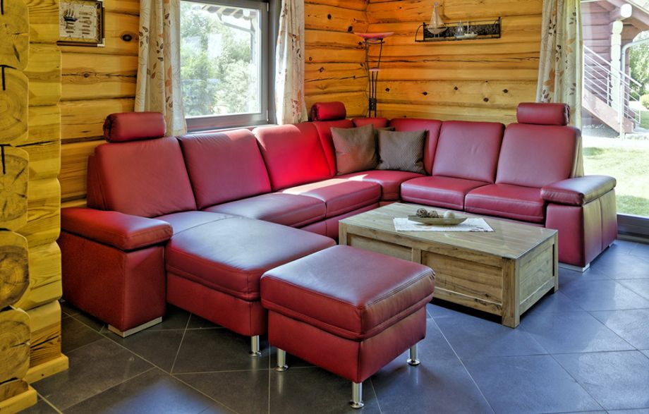Das große Sofa im Kolonialstil lädt zum Entspannen ein. Vom Balkon haben Sie Blick in den Garten und auf die Fass-Sauna.
