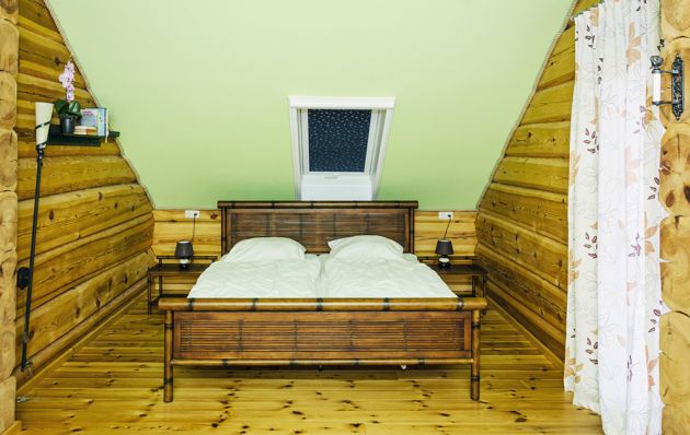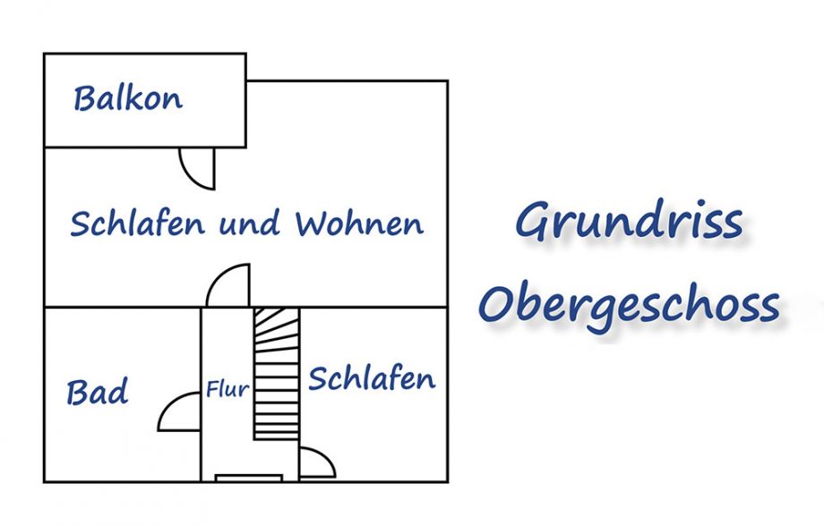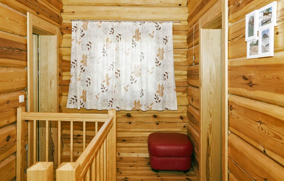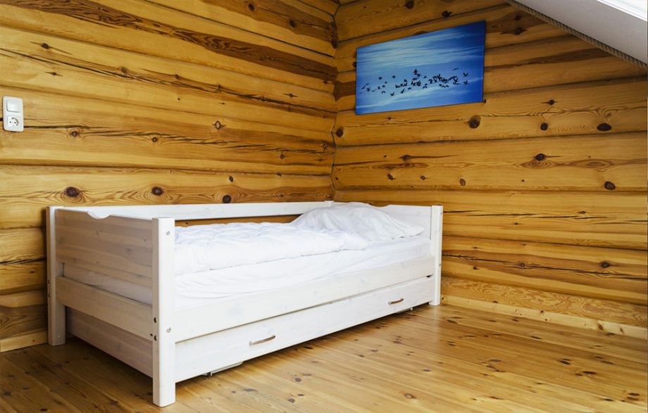Eine Holztreppe führt vom Flur ins Obergeschoss. Am Ende der Treppe befindet sich ein Kinder-Sicherungsgitter. Vom Flur im Obergeschoss haben Sie Zugang zum Schlafraum, einem Wohn- und Schlafraum und dem Bad.