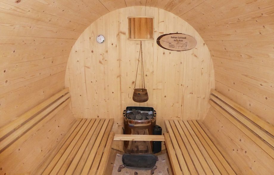 Im Garten steht eine Fass-Sauna. Wer beim Radeln nicht ins Schwitzen gekommen ist, dem treibt es spätestens dort den Schweiß aus den Poren.