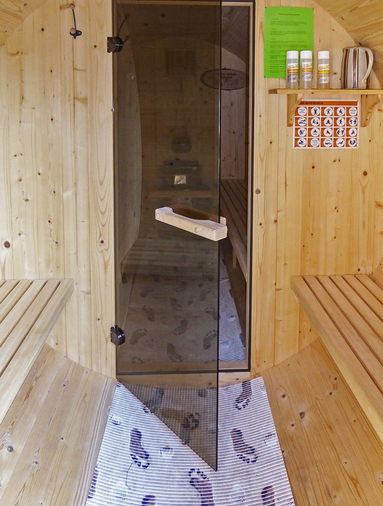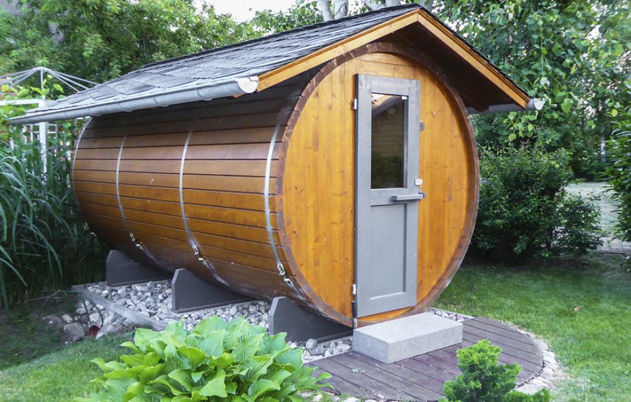 Im Garten steht eine Fass-Sauna. Wer beim Radeln nicht ins Schwitzen gekommen ist, dem treibt es spätestens dort den Schweiß aus den Poren.
