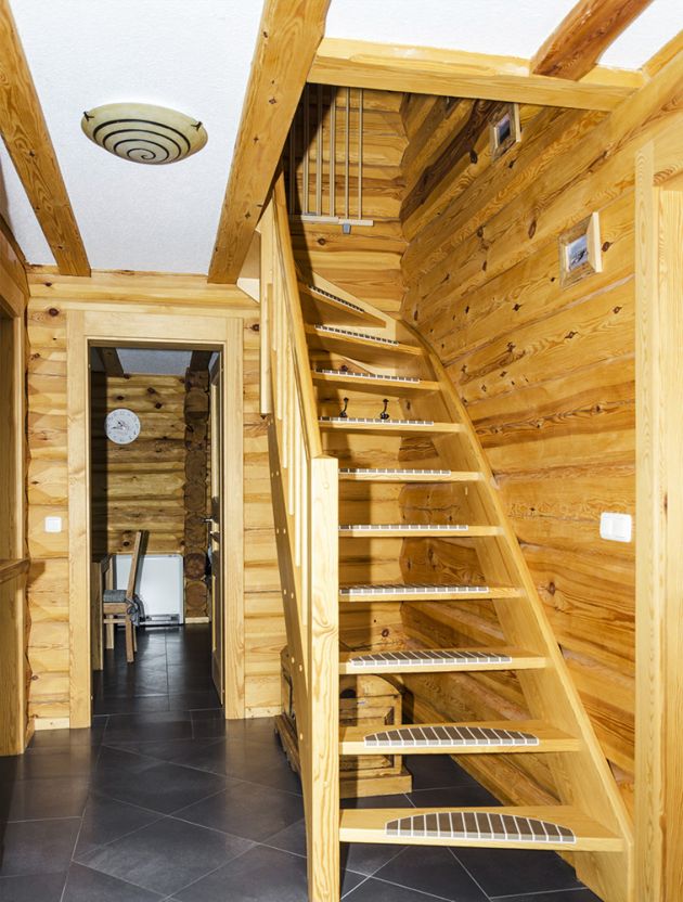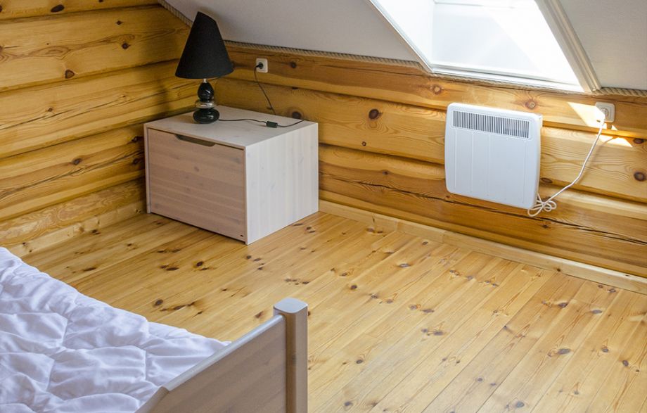 Eine Holztreppe führt vom Flur ins Obergeschoss. Am Ende der Treppe befindet sich ein Kinder-Sicherungsgitter. Vom Flur im Obergeschoss haben Sie Zugang zum Schlafraum, einem Wohn- und Schlafraum und dem Bad.
