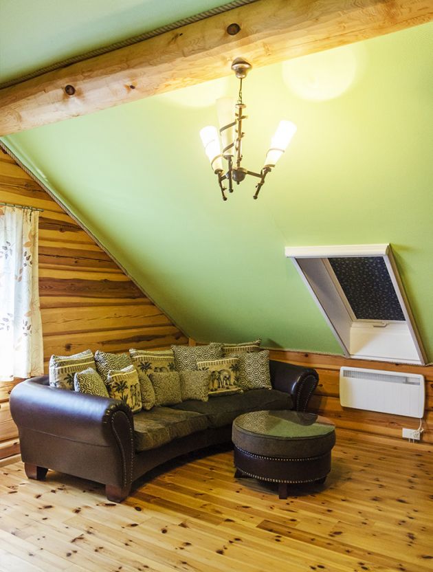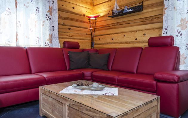 Das große Sofa im Kolonialstil lädt zum Entspannen ein. Vom Balkon haben Sie Blick in den Garten und auf die Fass-Sauna.